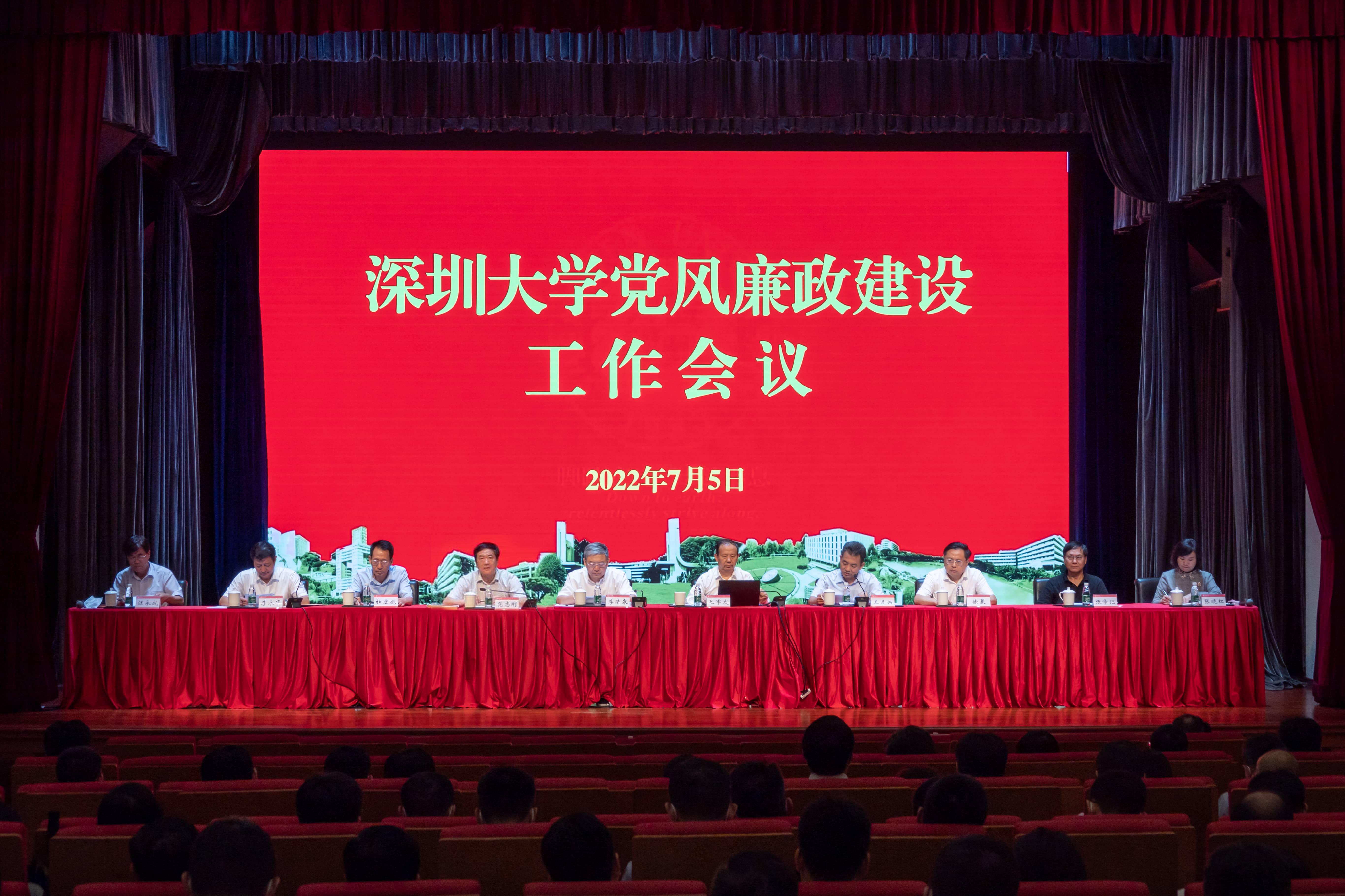 为进一步贯彻落实习近平新时代中国特色社会主义思想,全面落实十九届中央纪委六次全会、十二届省纪委七次全会、七届市纪委二次全会精神和校党委的有关工作部署,7月5日下午,深圳大学在粤海校区国际会议厅召开2022年党风廉政建设工作会议,总结近期学校纪检监察工作,并部署下一步党风廉政建设工作任务。