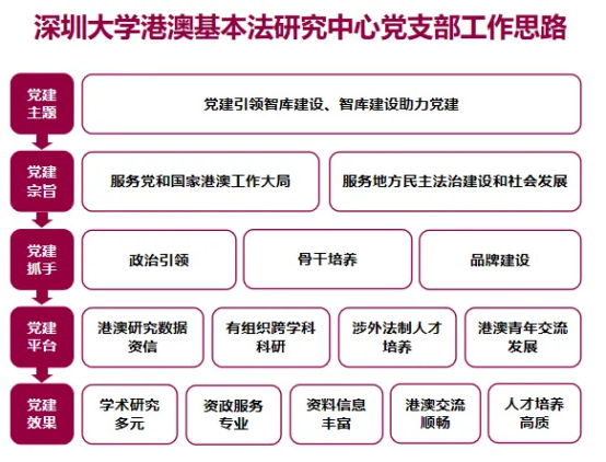 支部以“五讲五力”的新型智库党建工作体制机制,将党建与智库业务有机结合,走出了一条以特色党建引领特色智库建设、以高水平智库助推高质量党建的融合之路。中心两度获得“深圳市教育工作先进单位”称号,中心的咨政成果入选2021年中国智库特色案例“咨政建言”,是入选2022“中国智库索引”高校智库百强A+中唯一聚焦于港澳研究的机构,建有全国最大、最齐全的基本法研究专题数据库。