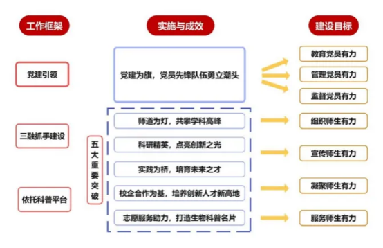 支部形成了以党建为轴,以科教融合、产教融合、赛教融合为业务抓手,以生物科普教育为服务平台,推动党建与业务发展相融合。党员教师发表了深大首篇《Nature》正刊论文、承担首个国家重点研发计划项目,获教育部、省教学成果奖十余项,指导学生在竞赛中获奖80余项,推动生物技术专业入选“国家一流本科专业建设点”,多名党员以科技特派员、志愿者等身份帮扶乡村、企业,科普教育服务5000余人次。
