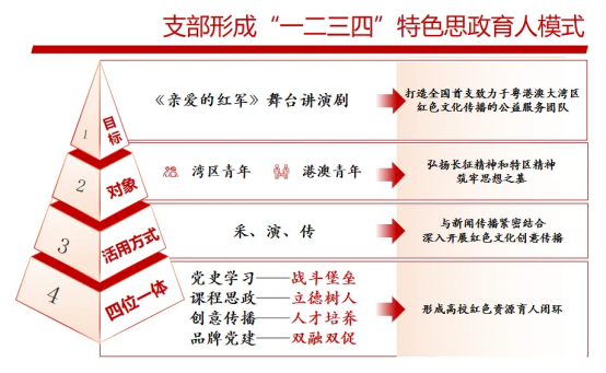 支部是全校首个跨学院跨专业的师生联合党支部,打造了党史学习、党建品牌、课程思政、创意传播“四位一体”红色资源育人模式,原创的舞台讲演剧《亲爱的红军》,在国内公益巡演42场,观众达6万余人,获得光明日报、人民网等主流媒体130余次报道,12次荣登学习强国,影响人数超180万,成为国内高校知名的红色文化传播品牌。
