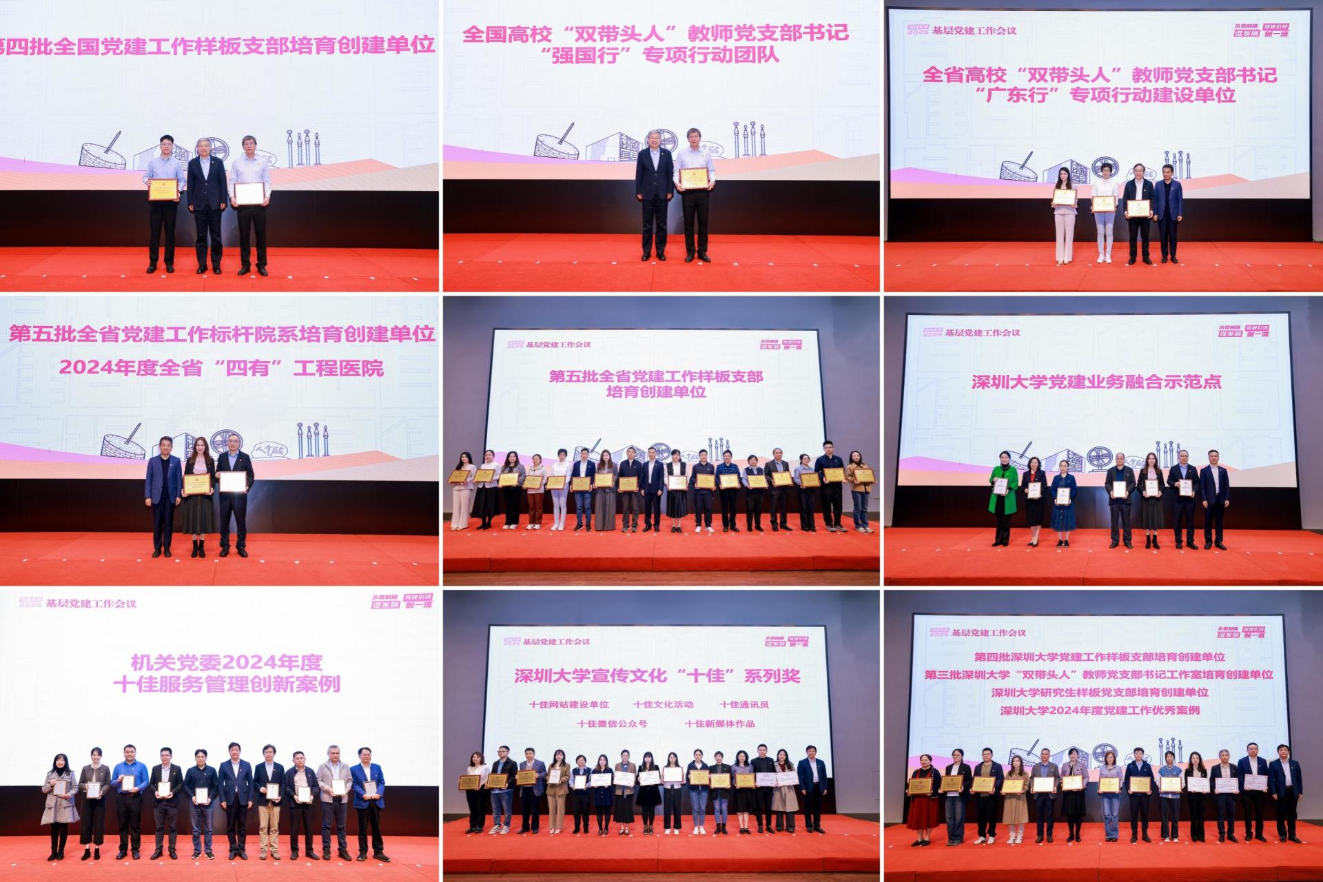 会议举行了基层党建工作颁奖及授牌仪式和深圳大学党建发展研究中心成立揭牌仪式。李清泉为入选全国党建工作样板支部、“双带头人”教师党支部书记“强国行”专项行动建设单位的代表授牌;党委副书记、纪委书记王月兴为入选“双带头人”教师党支部书记广东行专项行动建设单位、第五批全省党建工作标杆院系、2024年度全省“四有”工程医院的单位代表授牌;吴报水为入选第五批全省党建工作样板支部、深圳大学党建业务融合示范点的单位代表授牌;副校长李永华为获得机关党委2024年度十佳服务管理创新案例奖项的单位代表、获得深圳大学宣传文化“十佳”系列奖项的单位与个人代表颁奖,为入选深圳大学党建工作样板支部、“双带头人”教师党支部书记工作室、研究生样板党支部、2024年度党建工作优秀案例的单位代表授牌。