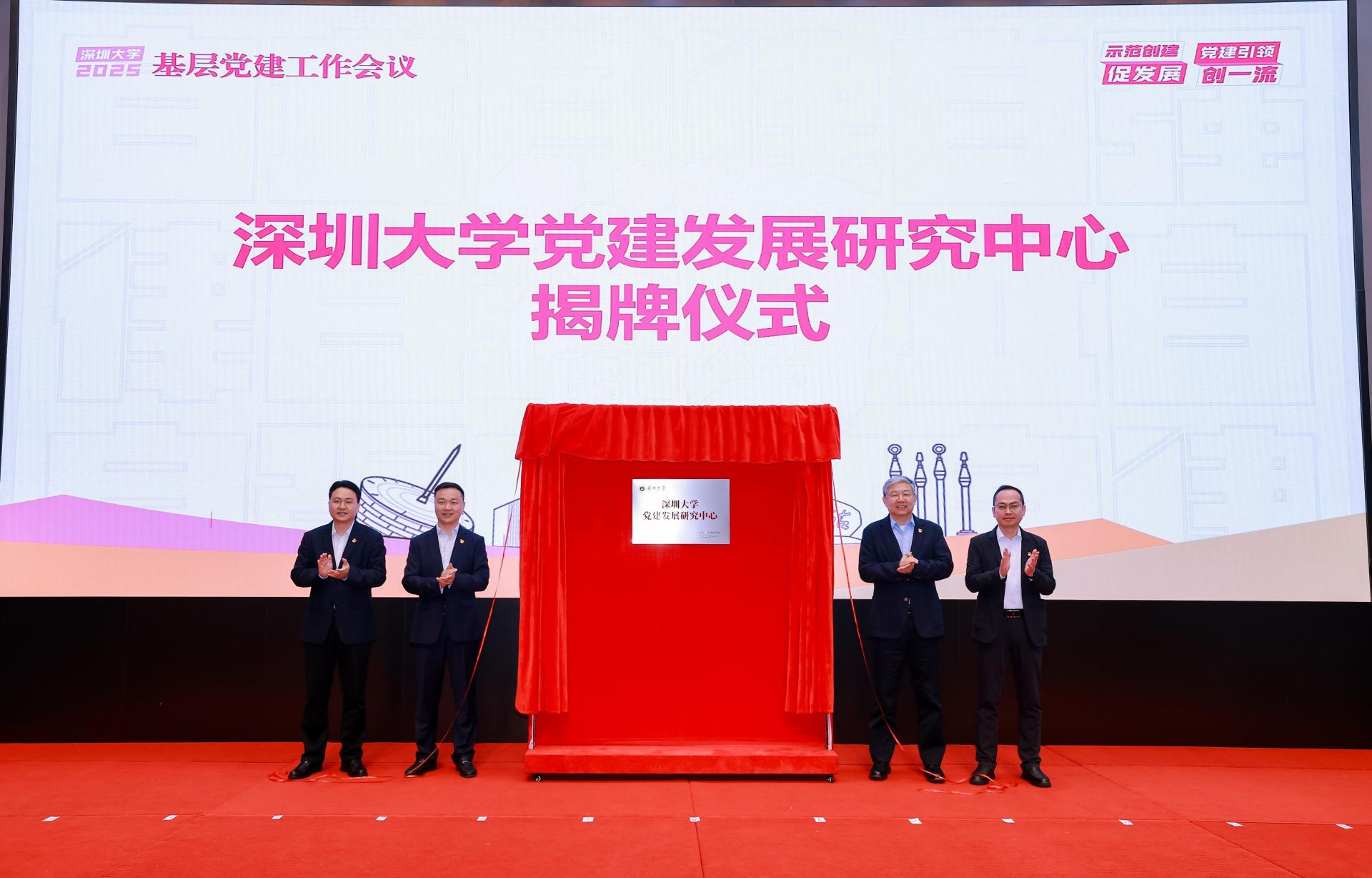 随后,深圳大学党建发展研究中心正式揭牌,该中心将聚焦党建理论与实践创新,整合校内外资源,开展党建课题研究、经验总结和成果推广,为学校党建工作提供理论支撑和智力支持。