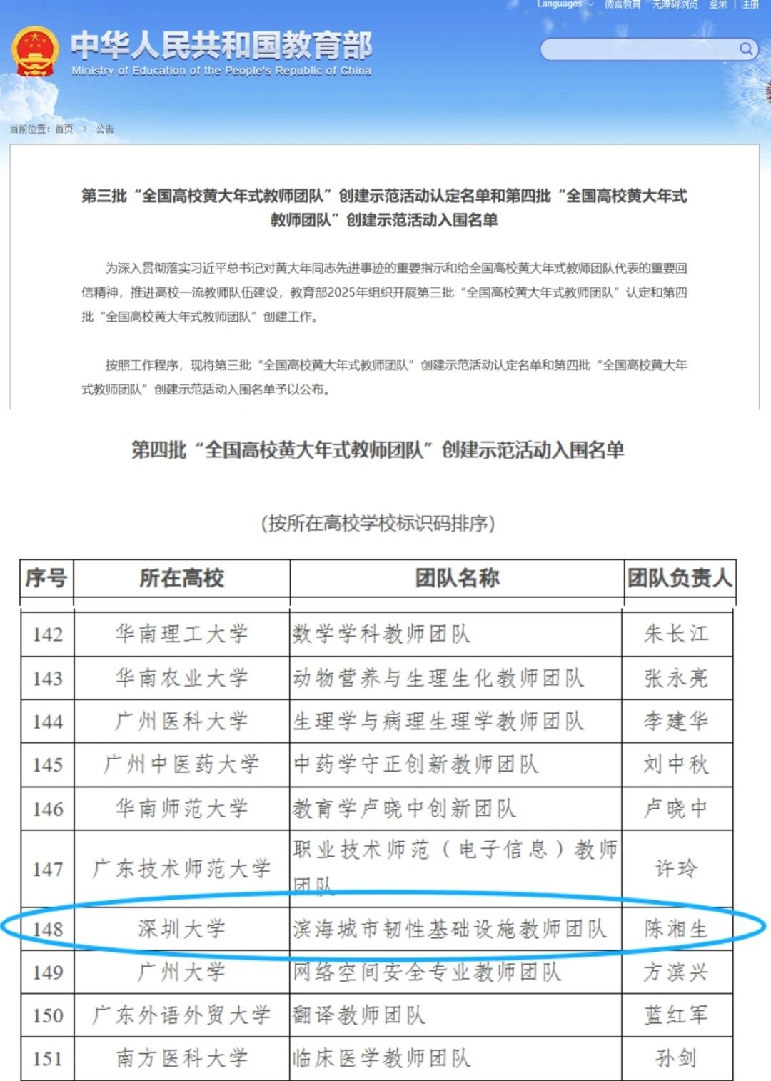 近日,第四批“全国高校黄大年式教师团队”创建示范活动入围名单正式公布,深圳大学土木与交通工程学院院长、中国工程院院士陈湘生领衔的“滨海城市韧性基础设施教师团队”成功入选!