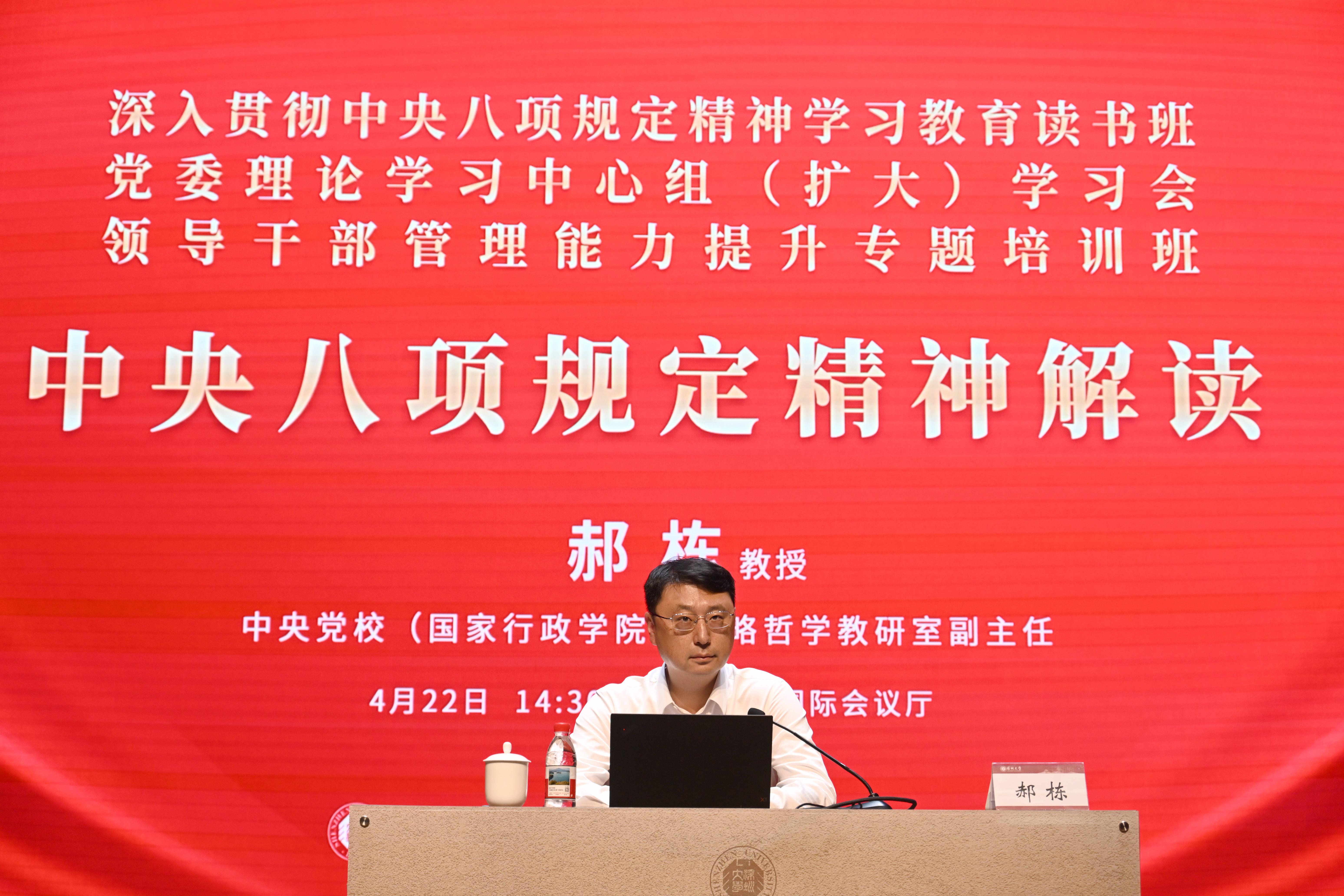 4月22日下午,深圳大学在粤海校区国际会议厅举办深入贯彻中央八项规定精神学习教育读书班暨党委理论学习中心组(扩大)学习会暨领导干部管理能力提升专题培训班第二期讲座,中共中央党校(国家行政学院)战略哲学教研室副主任郝栋教授受邀作“中央八项规定精神解读”专题授课。校领导、党委委员、中层领导干部、新聘任七级八级管理人员等共300余人参加学习。党委副书记吴报水主持学习会。此次学习会也是深圳大学“荔园金声讲堂”和“荔园先锋大学堂”宣讲活动之一。